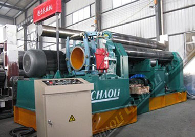 本機結構型式為三輥對稱式,上輥在兩下輥中央對稱位置作垂直升降運動,通過絲桿絲母蝸桿傳動而獲得,兩下輥作旋轉運動,通過 減速機的輸出齒輪與下輥齒嚙合,為卷制板材提供扭矩。本機床的缺陷是需借助其它設備實現預彎。本設備可卷板厚1mm-40mm,板寬8000mm的板料。